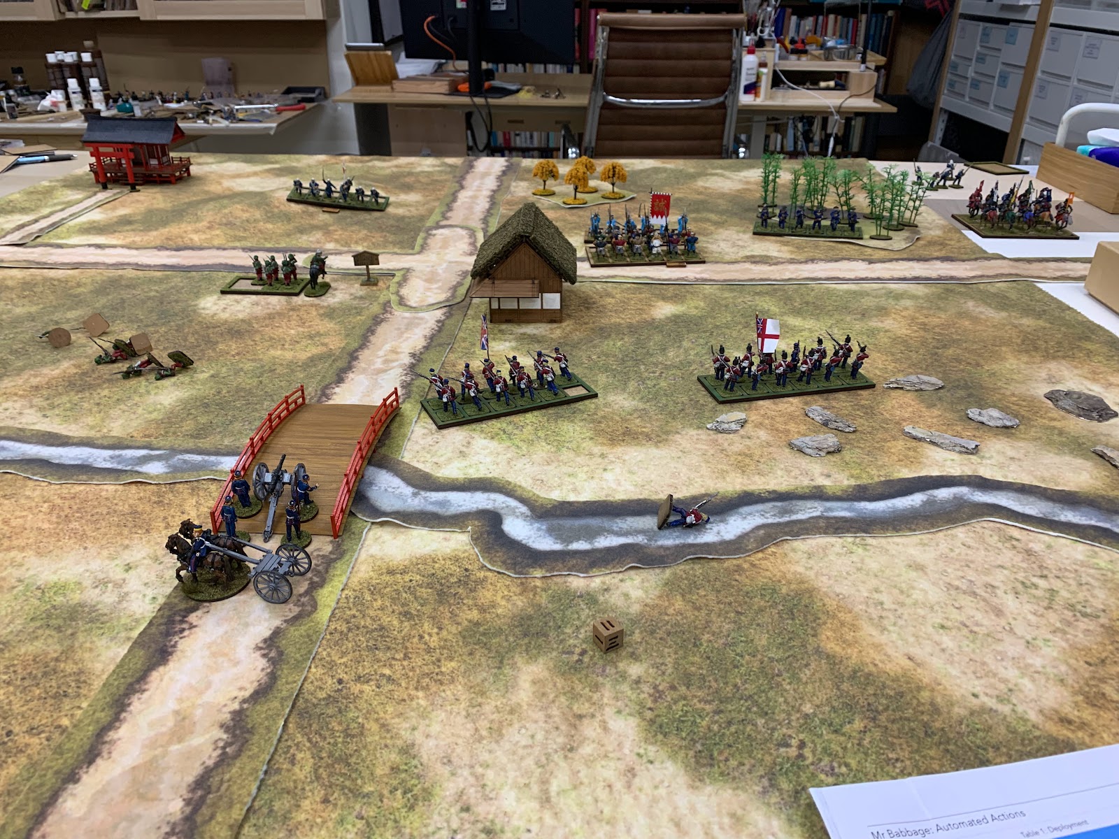 As my self-imposed scenario objective, to give myself some reason to advance, I decided that my 1864 Anglo-Indian force had been tasked with securing a crossroads just over a bridge. The crossroads would be 4 feet away from my deployment, and the stream 2 feet in, counting as a fordable Obstacle for infantry and cavalry but impassable to artillery. There would be an inn at the crossroads (handled using the rules for buildings in the Satsuma Rebellion scenario book), and various obstructions scattered about – two hills (they're hard to spot in most of the photos, as they were formed using layered cardboard templates underneath the mat), three areas of woodland, and some rocky ground on the right opposite bank of the stream.